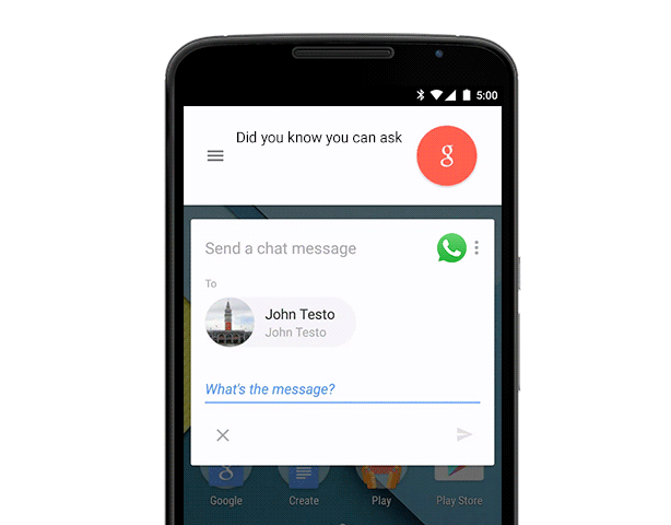 تطبيق المساعد الشخصي الإفتراضي Google Now الذي أطلقته غووغل لمنصة الأندرويد كان يسمح للمستخدمين بالبحث أو إرسال رسائل نصية مكتزبة باستخدام الصوت فقط، لكن هذه الميزة كانت تقتصر على البحث فقط عبر محرك البحث، و أيضا على تطبيق Google Hangouts الذي يعتبر تطبيق المراسلة الإفتراضي على منصة الأندرويد.